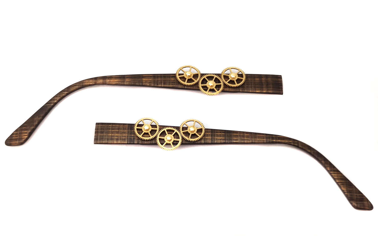 Bei diesem Model haben wir auf die 135 mm langen Kunststoffbügel echte Zahnräder aus Messing montiert, die drehbar sind und ineinander greifen. Da diese nur 0,5 mm dick sind, sollten die Zahnräder nur langsam und behutsam gedreht werden.
