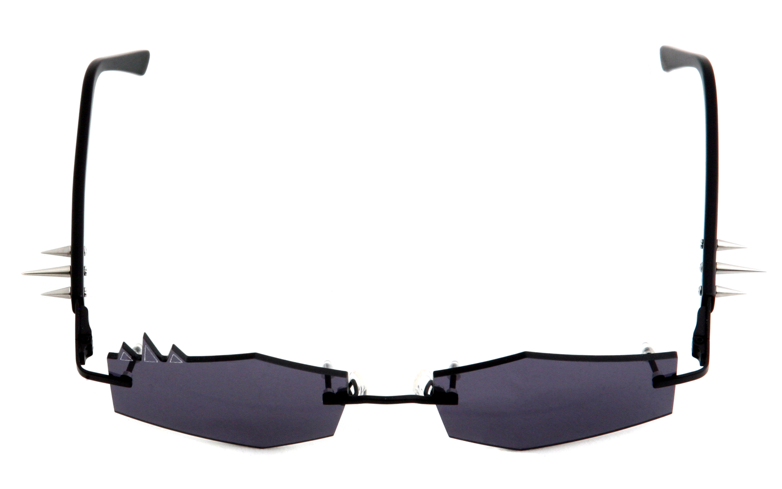Bei dieser Fledermausbrille ist der Brillenglasrand schwarz und die Gravur weiß lackiert. Die Gläser sind 85% Grau getönt.