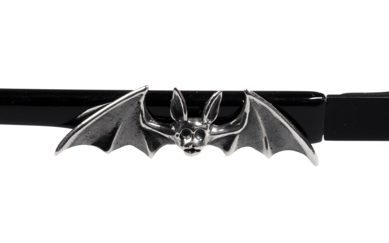 Bei dieser Fledermausbrille ist der Brillenglasrand schwarz lackiert. Der Bügelschmuck aus 925er Sterlingsilber ist fest an beide Bügeln montiert. Hier kann auf Wunsch auch Silberschmuck von anderen Fledermausbrillen montiert werden.