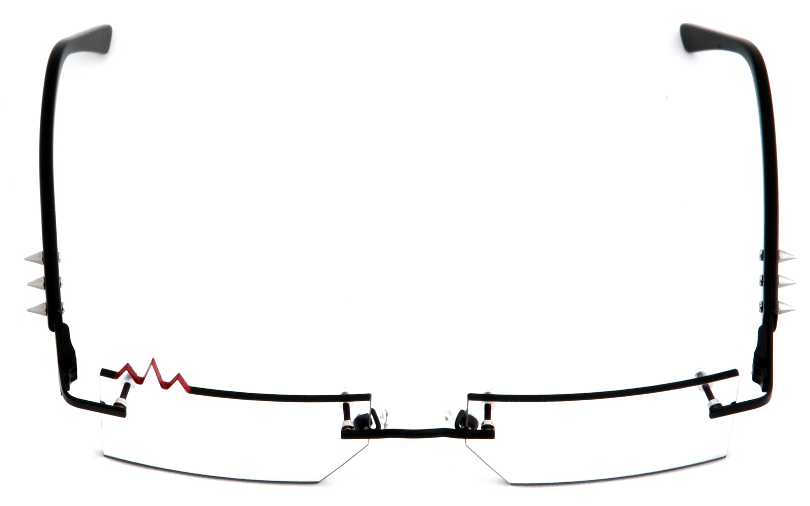 Bei dieser Fledermausbrille ist der Brillenglasrand schwarz und der Glasrand der Spitzen rot lackiert. Auf den Bügeln sind je drei Spitzen aus Chirurgenstahl fest montiert.